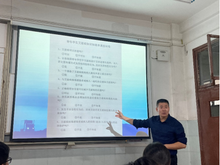 之后,许老师通过提问了解员工对艾滋病的知识的知晓率,并向同学们做了艾滋病知识的普及。艾滋病并不会通过接触、眼泪、汗液或唾液传染,正确了解传播途径,可以有效预防感染;患有性病后也应及时、积极地进行治疗。